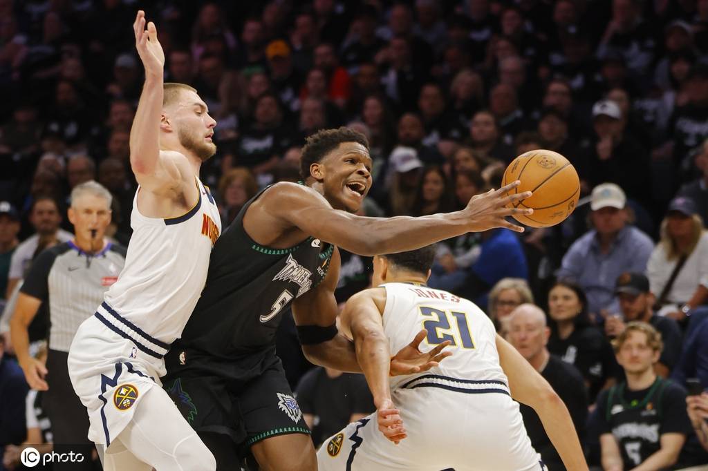 森林狼队首发:安东尼-爱德华兹、鲁迪-戈贝尔、贾登-麦克丹尼尔斯、朱利叶斯-兰德尔、丹特-迪文琴佐